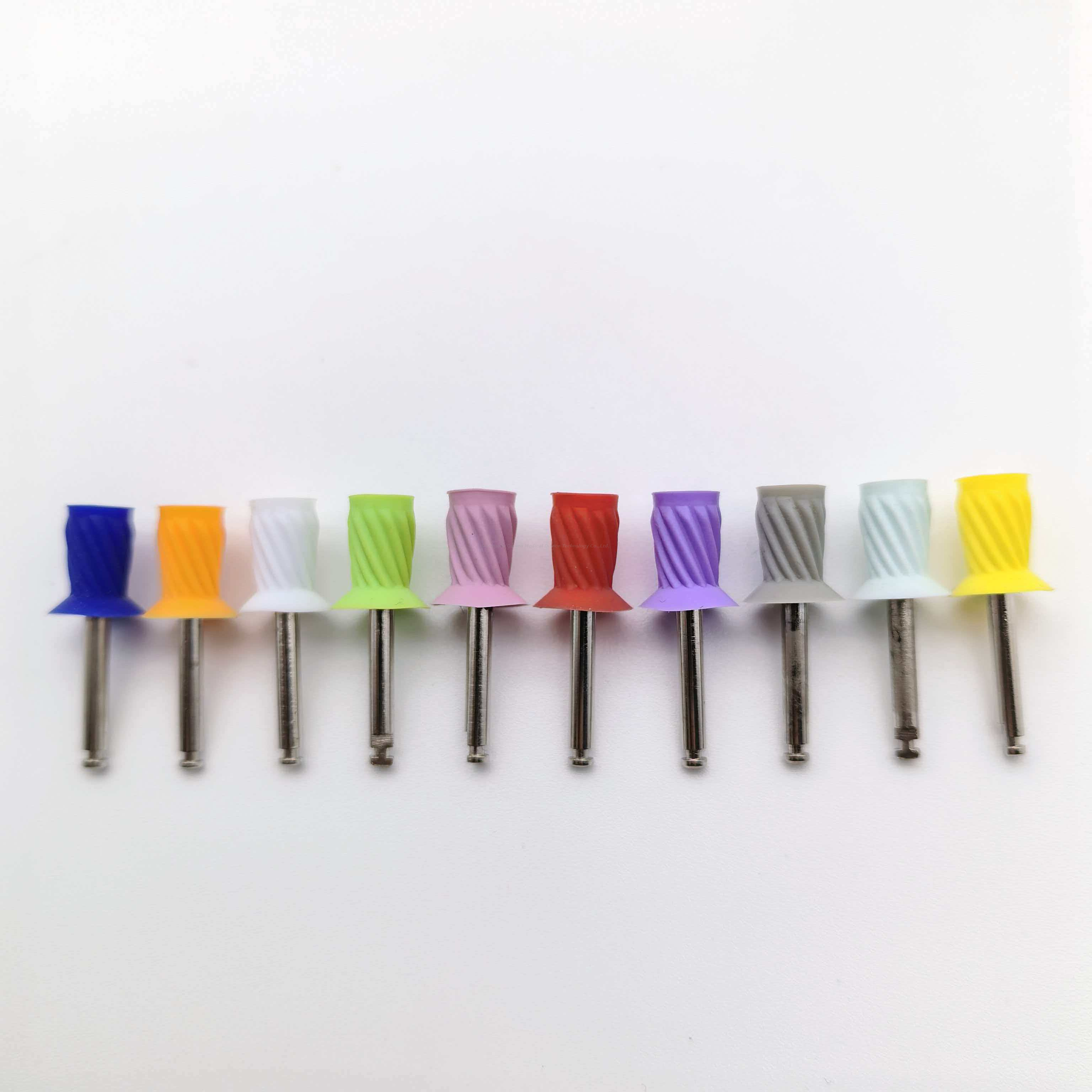 Specifically designed for precise oral polishing, featuring an innovative "internal thread + external spiral" dual structure. The latch-type handpiece interface ensures secure installation without loosening, preventing slippage or detachment during high-speed rotation. The external spiral pattern increases contact area with tooth surfaces, and when combined with the elastic tension of medical-grade silicone material, it can adapt to different tooth surface curvatures, achieving full coverage of hard-to-polish areas such as pits, fissures, and interproximal spaces.